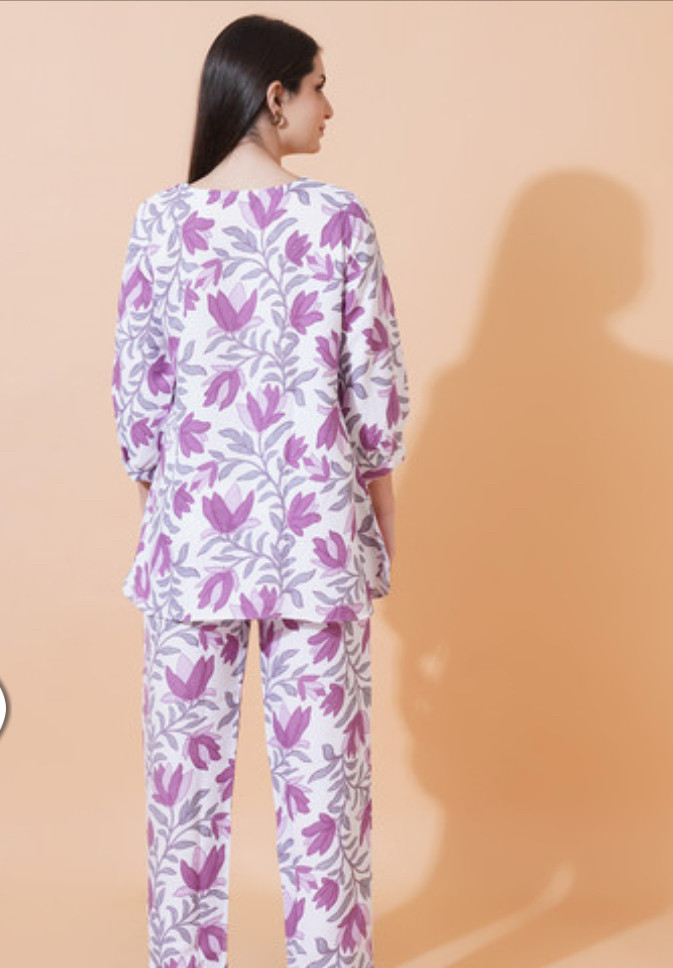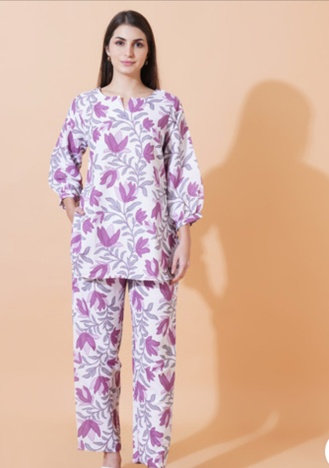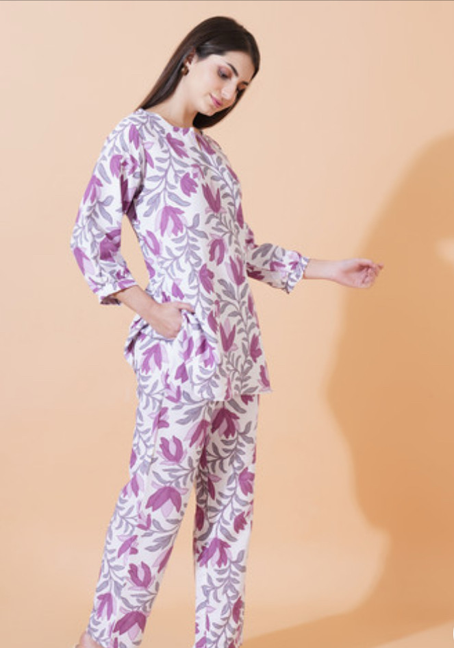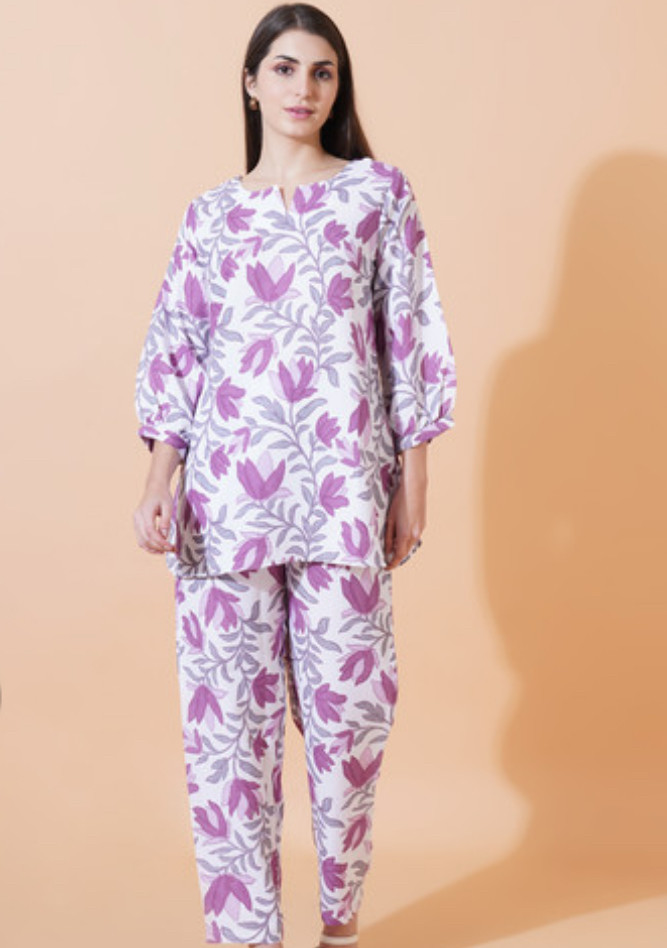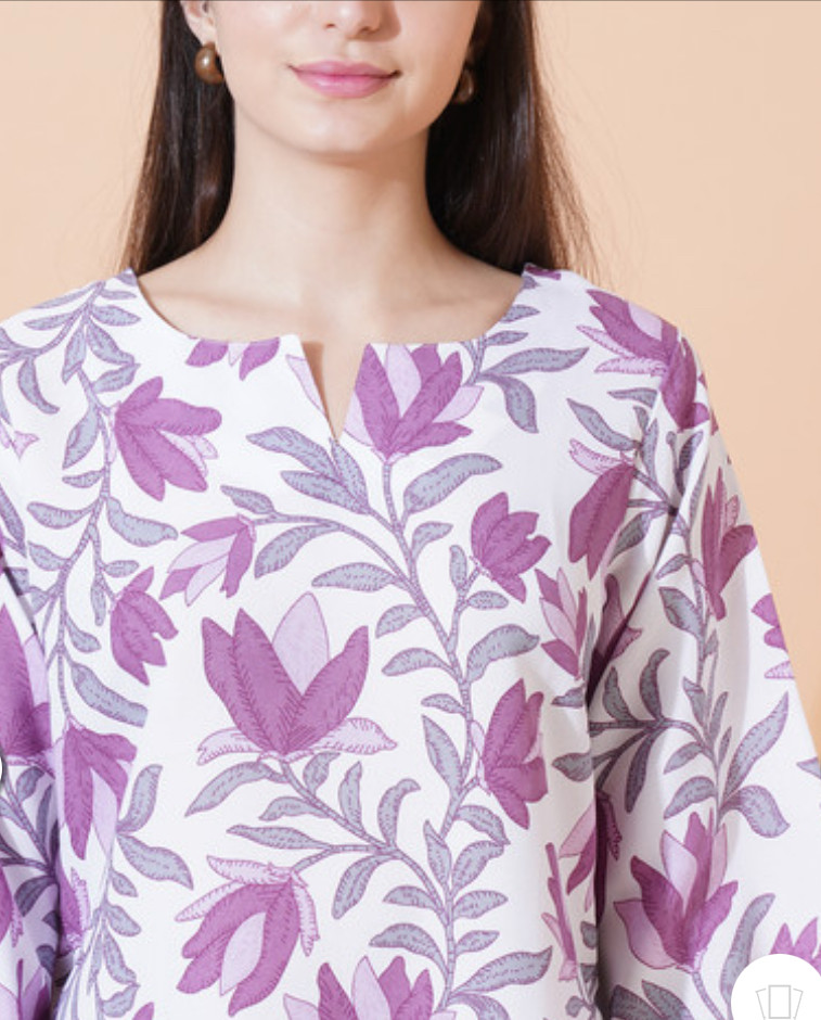 A Woman Wearing A Modern, Cream-Colored Kurta With A Bold Black Botanical Print. The Kurta Has A Straight Fit With Three-Quarter Balloon Sleeves Featuring Elasticized Cuffs And A Small Notch Neckline. The Ensemble Is Paired With Matching Printed Straight Pants, Giving A Coordinated And Contemporary Look. The Outfit Is Finished With White Strappy Heels, Offering A Chic And Polished Appearance.