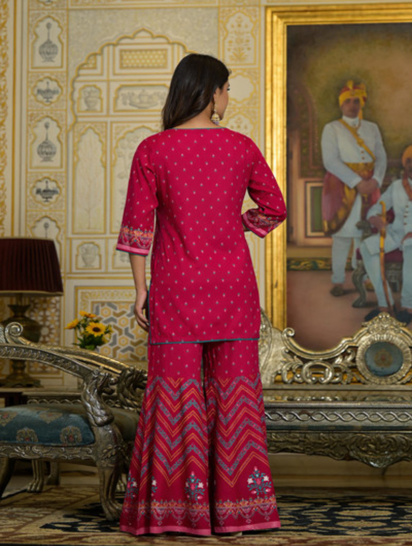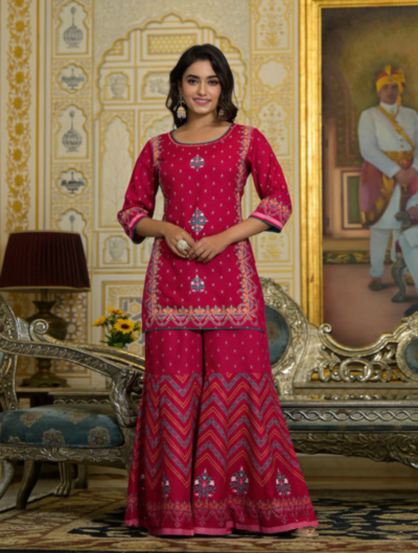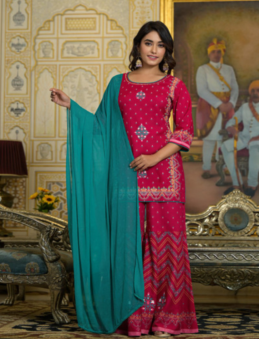 Fuchsia Ethnic Motif Printed Liva Rayon Tunic Sequins & Gota Patti Work Sharara and Dupatta 188