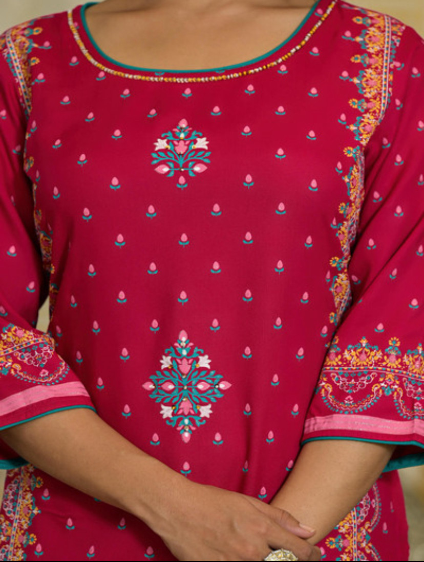Fuchsia ethnic motif printed Liva Rayon kurta set with sequins and gota patti work. Features a straight, Hip Length kurta with a round neck and three-quarter regular sleeves. Paired with a