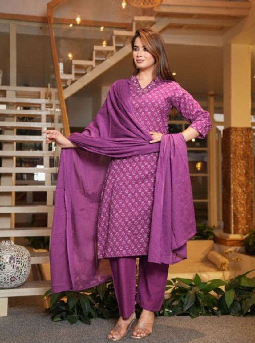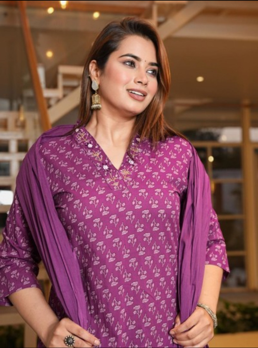 Plus Size Cotton Purple Straight Kurti with Pant and Dupatta is a comfortable and elegant ethnic set. The straight-cut kurti offers a flattering fit, made from breathable cotton for all-day comfort. Paired with matching cotton pants for ease of movement and a lightweight dupatta to complete the look, this outfit is perfect for casual, festive, and office wear.