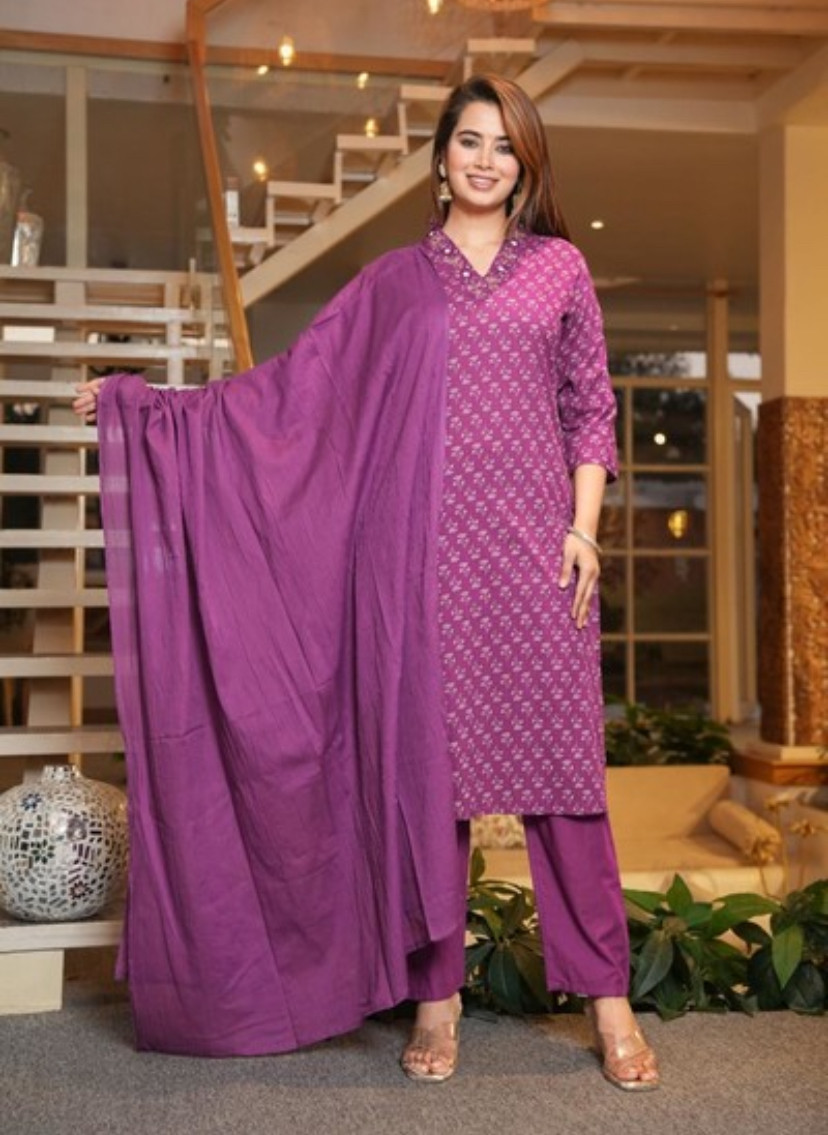 (Plus Size) Cotton Purple Colored Straight Kurti with Pant and Dupatta 201